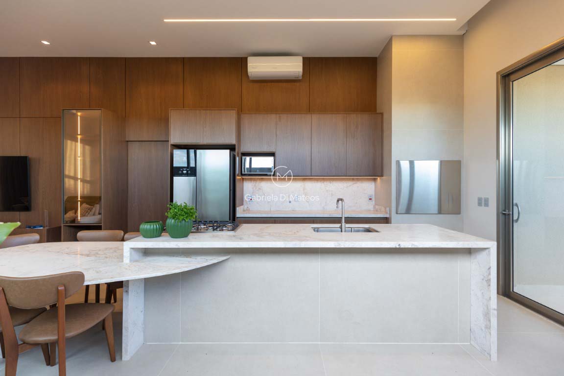 – Espaço gourmet integrando sala de TV, sala de jantar e cozinha com churrasqueira