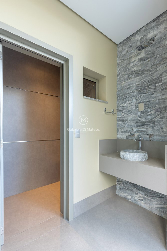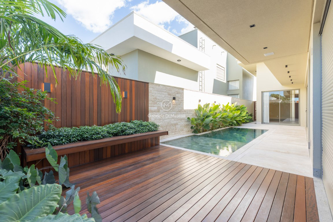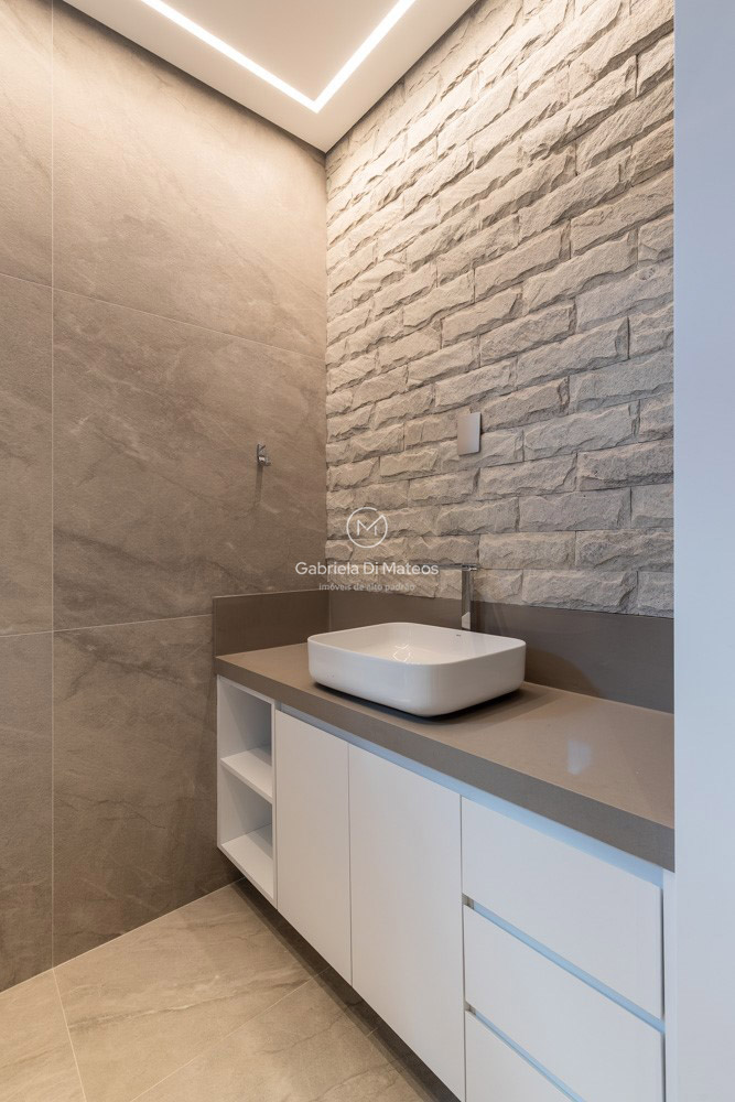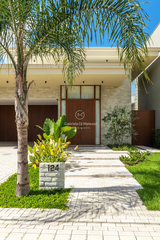 A fachada tem estilo contemporâneo com ripado em alumínio, pedras naturais e vidro.