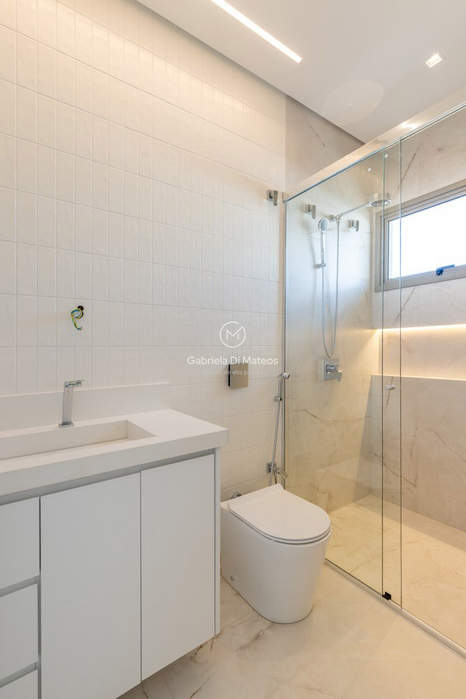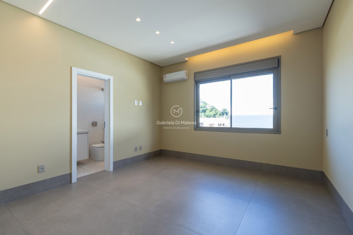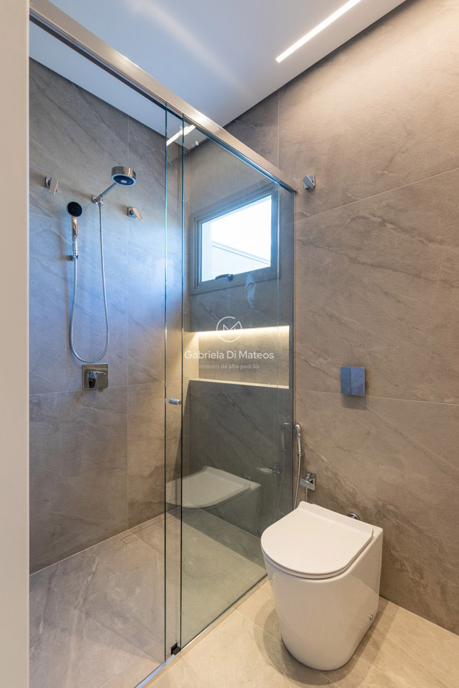 Em laje com forro de gesso e esquadrias em alumínio (automatizadas nos quartos).